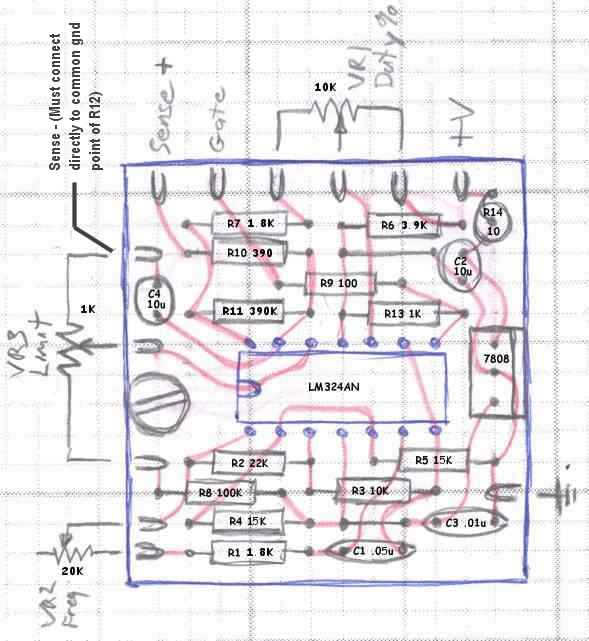 R12 is a 4.5" piece of 16ga stranded speaker wire or appliance power cord. One end is shorted together. The two leads at the other end are connected to the Source of the MOSFET, AT THE SOURCE TERMINAL, and to the common ground, AT THE COMMON GROUNDING POINT. Also, the PC board terminal at the junction of C4/VR3 connects directly to the common ground and the PC board terminal for R10 connects directly to the MOSFET Source terminal. These steps are very important to observe as unwanted oscillations and instability can occurr.